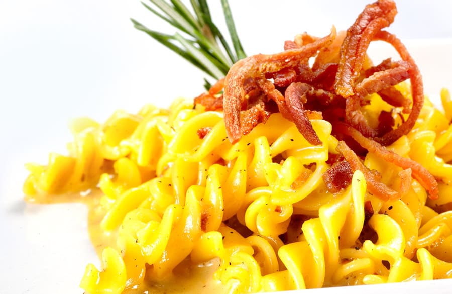 Agregar una amarilla de huevo por cada 100 g de pasta, mezclar y servir.